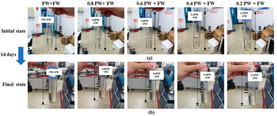 FW+ different saline PW mixture at (a) initial states and (b) final states.