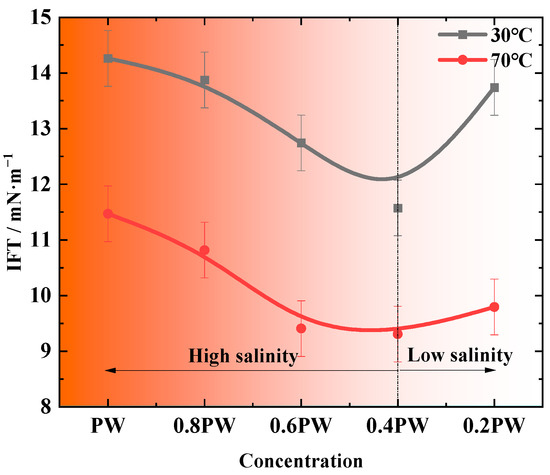 As shown in Figure 7, temperature exerts a significant influence on the interfacial tension (IFT) of the water/oil system. An increase in temperature clearly reduces the IFT, although the overall trend with salinity remains similar. At both 30 °C and 70 °C, the IFT initially decreases with decreasing salinity, reaching a minimum value at a certain dilution level, and then increases thereafter. At 30 °C, the IFT of undiluted PW was 14.263 mN/m. As salinity decreased, the lowest IFT value of 11.574 mN/m was observed at 0.4 PW, after which the IFT increased again. At 70 °C, the IFT of PW was 11.47 mN/m, with a minimum of 9.308 mN/m at 0.4 PW, followed by an increase to 9.795 mN/m. This indicates that direct injection of low-temperature water into the reservoir can lead to an increase in capillary forces between oil and water. Capillary force is a key resistance that traps residual oil and hinders crude oil flow. Elevated capillary forces significantly reduce displacement efficiency, resulting in more oil being retained in the pore spaces and remaining unrecovered. Meanwhile, under low-temperature conditions, the ability of low-salinity water to reduce interfacial tension (IFT) is considerably weakened. Although low-salinity water at 0.4 PW still leads to a relative reduction in IFT, the minimum IFT achieved is less favorable compared to high-temperature conditions. This suggests that the oil recovery enhancement effect of low-salinity water injection becomes less effective in cold environments, thereby limiting its potential to increase production. From the perspective of enhanced oil recovery optimization, it is therefore recommended to increase the temperature of the injected water in practical field applications. Higher temperature can reduce the adverse effects of capillary forces. Moreover, selecting an appropriate low-salinity ratio under elevated temperature conditions is more effective in reducing interfacial tension and improving displacement efficiency.