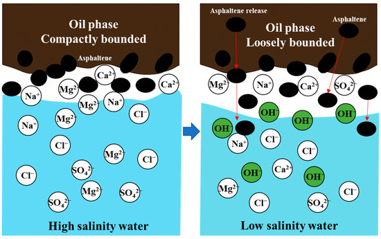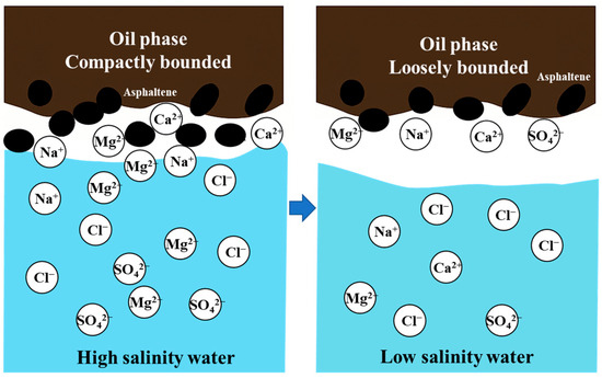 Across all salinity levels, IFT values at 70 °C were consistently lower than those at 30 °C, indicating that elevated temperatures promote interfacial tension reduction. This temperature-dependent behavior may be attributed to the enhanced thermal motion of asphaltene molecules at higher temperatures, facilitating their spontaneous adsorption at the oil–water interface. This adsorption strengthens the effect of naturally occurring surface-active components, thereby reducing IFT. Additionally, the increased interaction between asphaltene molecules and salt ions at elevated temperatures may further contribute to IFT reduction. As illustrated in Figure 8, the complex interplay between salinity, temperature, and the interactions among natural surfactants in the oil phase and salt ions can explain this phenomenon [45]. Asphaltene molecules contain both hydrophilic and hydrophobic functional groups, resembling synthetic surfactants, and can spontaneously adsorb at the oil–water interface to reduce IFT [46]. With rising temperature, the activity of asphaltenes increases, and the diffusivity of salt ions also becomes more significant. The binding affinity between divalent cations (e.g., Ca2+ and Mg2+) and asphaltenes is enhanced, further reducing IFT [46]. Therefore, higher temperatures intensify the modulation of oil–water interfacial behavior, making the effect of salinity variations on IFT more pronounced. This results in more significant IFT fluctuations across different salinity levels.