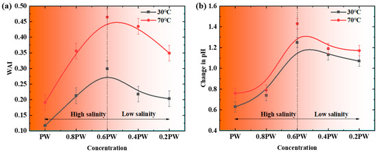 Wettability refers to the tendency of a rock surface to be preferentially covered by either oil or water when both fluids are present. In sandstone reservoirs, water-wet conditions indicate that the rock surface is predominantly covered by a thin water film, while oil is distributed in the center of the pores. This condition is generally favorable for water flooding, as the injected water can flow along the rock surface and more effectively displace the oil within the pores. In contrast, if the reservoir exhibits oil-wet characteristics, oil tends to adhere strongly to the rock surface, leading to higher residual oil saturation and reduced water flooding efficiency. Therefore, wettability is one of the key parameters that determine oil displacement efficiency and enhanced oil recovery (EOR). It plays a critical role in the design and optimization of water injection development strategies. To evaluate the effect of temperature on wettability alteration, the wettability alteration index (WAI) was calculated under various salinity conditions. As shown in Figure 9, the WAI reached its maximum at 0.6 PW at both 30 °C and 70 °C. However, temperature induced a significant change in wettability. At 30 °C, the WAI was 0.2994, and at 70 °C, it increased to 0.4647. Both values were higher than those at other salinity levels, with the WAI at 70 °C significantly exceeding that at 30 °C. Temperature variation also caused noticeable changes in pH. At both 30 °C and 70 °C, pH increased markedly as salinity decreased. Specifically, at 30 °C, the pH rose from 0.63 (PW) to 1.25 (0.6 PW), and at 70 °C, it increased from 0.76 to 1.43. As shown in Figure 10, higher pH values promote the dissociation of polar acidic components in crude oil. This increases the negative charge at the interface, strengthens electrostatic repulsion, stabilizes the water film, and promotes a transition toward more water-wet conditions. As temperature increased, the WAI increased accordingly, especially under the 0.6 PW condition. Higher temperature enhances the thermal motion between the oil and water phases, which promotes the interaction between naturally occurring surface-active molecules in crude oil, such as asphaltenes, and salt ions [47]. This facilitates more effective adsorption of these surfactants at the oil–water interface, reduces interfacial tension, and improves water-wetness. In addition, elevated temperature accelerates chemical reactions between the solution and the rock surface, such as hydrolysis, protonation, and deprotonation, thereby increasing the pH value [48]. Under high-temperature conditions, water-wetness is further enhanced, oil droplet adhesion is reduced, and the water film becomes more stable. Although the interfacial tension reached its minimum at 0.4 PW, the WAI did not peak under this condition. The highest wettability alteration was observed at 0.6 PW. This can be explained by the combined influence of salinity on ion concentration, surfactant adsorption capability, interfacial charge, and pH [49]. At 0.4 PW, the ion concentration was relatively low. Although the concentration of divalent cations such as Ca2+ decreased, the reduction was not sufficient to support effective adsorption of natural surfactants such as asphaltenes at the oil–water interface, which limited wettability improvement. At the same time, the rise in pH promoted dissociation of acidic components, which increased interfacial charge and further stabilized the water film. As a result, the most significant change toward water-wetness occurred at 0.6 PW.