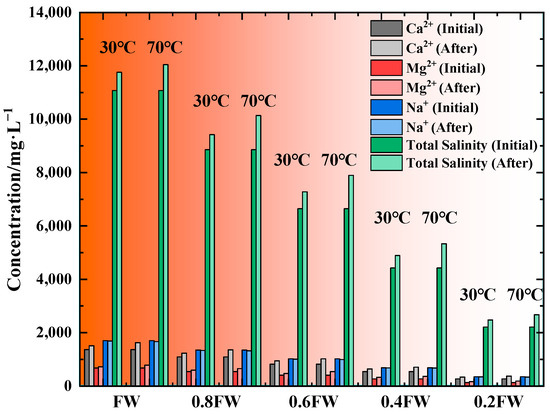 The interaction between injected water and reservoir rocks involves ion exchange and mineral dissolution at the mineral–water interface. This process is particularly pronounced under high-temperature conditions. By comparing the changes in ion concentrations at 30 °C and 70 °C for solutions of varying salinities (FW, 0.8 PW, 0.6 PW, 0.4 PW, and 0.2 PW), it was observed that the release of Ca2+ and Mg2+ increased with rising temperature. This indicates that elevated temperatures enhance cation mobility and promote rock–fluid chemical reactions. As shown in Figure 11, in the 0.6 PW system, the concentration of Ca2+ increased from an initial value of 819.2 mg/L to 946.5 mg/L at 30 °C and further to 1020.8 mg/L at 70 °C. Similarly, Mg2+ increased from 406.1 mg/L to 470.3 mg/L at 30 °C and to 540.8 mg/L at 70 °C, corresponding to increases of approximately 25% and 33%, respectively. This thermally enhanced cation release was also observed in other systems. In the 0.8 PW solution, Ca2+ increased by about 10% at 70 °C compared to 30 °C. The 0.4 PW and 0.2 PW systems also exhibited significant temperature-driven cation release. In the high-salinity FW system, the concentration of Ca2+ increased from 1365.4 mg/L at 30 °C to 1628.5 mg/L at 70 °C, and Mg2+ increased from 676.9 mg/L to 782.3 mg/L. These results confirm that temperature can significantly enhance mineral dissolution and ion exchange, even under high ionic strength conditions. The overall trend in total salinity further supports this conclusion. Taking the 0.6 PW system as an example, total salinity increased from an initial value of 6642.6 mg/L to 7275.8 mg/L at 30 °C and to 7896.2 mg/L at 70 °C, suggesting that higher temperatures enhance overall dissolution processes. The release of divalent cations is closely related to the dissolution of clay minerals, such as chlorite and kaolinite, present in the core material. Elevated temperature accelerates the breakdown of these minerals, resulting in increased concentrations of Ca2+ and Mg2+ in the aqueous phase. This alters the ionic composition and strength at the rock–brine interface, affecting surface charge distribution and adsorption equilibria. These changes have a direct impact on wettability alteration, zeta potential, and the desorption of polar oil components. Notably, in low-salinity systems such as 0.2 PW and 0.4 PW, despite initially low ion concentrations, significant cation release was still observed at 70 °C. This suggests that even dilute solutions may trigger ion activation effects at the rock–water interface under thermal conditions.