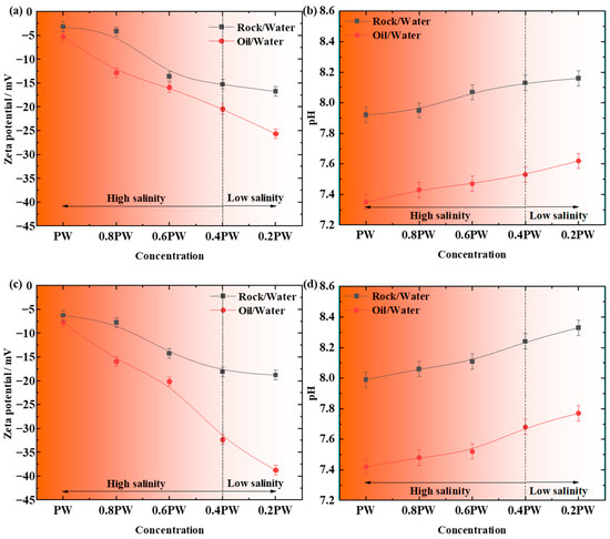 Effect of salinity on zeta potential and pH in water–rock and water–oil systems at 30 °C (a,b) and 70 °C (c,d).