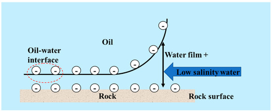 As conventional oil reservoirs are gradually depleted and global energy demand continues to grow, the development of tight sandstone reservoirs becomes increasingly important. However, because tight sandstone formations have low permeability, high water saturation, and complex pore structures, traditional oil recovery methods can hardly achieve high enhanced oil recovery (EOR) performance [1,2]. Therefore, researchers keep looking for new EOR technologies. Among them, low-salinity water flooding has become a research focus. This method changes the salinity of the injected water. It affects the wettability of the reservoir rock surface. It reduces the capillary trapping of oil in the pores and increases the mobility of crude oil. At the same time, low-salinity water can reduce oil–water interfacial tension (IFT), improve the flow behavior of the oil and water phases, and enhance the relative permeability of the two phases [3,4].