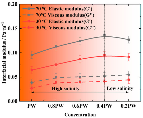 The rheological behavior of the oil–water interface plays a crucial role in oil and water transport through porous media. During the displacement process, the formation and breakup of oil droplets largely depend on the interfacial elastic modulus. A higher interfacial elastic modulus can effectively resist droplet rupture, allowing for the formation of larger droplets, thereby improving oil recovery. Figure 14 shows the variations in the elastic modulus (G′) and viscous modulus (G″) of the oil–brine interface under different temperature conditions. At lower salinity levels, the elastic characteristics of the oil/brine interface are enhanced, resulting in more stable oil droplets [17]. In addition, significant differences in interfacial moduli were observed between 30 °C and 70 °C. At 70 °C, both G′ and G″ increased as salinity decreased. Under PW conditions, the elastic modulus reached 0.0955 Pa/m and the viscous modulus reached 0.0386 Pa/m. Under 0.4 PW conditions, the elastic modulus increased to 0.137 Pa/m and the viscous modulus to 0.0518 Pa/m. These results indicate a more elastic interface, which is favorable for the formation and stability of oil droplets. However, at very low salinity, a decrease in the elastic modulus was observed, suggesting that the interface structure becomes looser, making droplets more prone to rupture and less stable. Across all conditions, the moduli at 30 °C were generally lower than those at 70 °C, particularly the elastic modulus. As temperature increased, both G′ and G″ exhibited a significant upward trend. This behavior may be attributed to enhanced interactions between asphaltene molecules in the oil phase and salt ions at higher temperatures, which promote interfacial structure formation and molecular network reorganization. A denser and more ordered interfacial structure may form under elevated temperatures, enhancing the interface’s stability and elasticity [56]. These findings demonstrate that salinity and temperature have a pronounced effect on the elastic and viscous moduli of the oil/brine interface. Figure 15 illustrates the mechanism by which viscoelastic properties influence crude oil mobility and stability. Under high-salinity and high-temperature conditions, the interfacial moduli are greater, reducing the likelihood of droplet breakup and facilitating the formation of stable droplets, which improves oil recovery. Conversely, under lower salinity and temperature conditions, smaller interfacial moduli may lead to a looser interfacial structure, decreasing droplet stability and adversely affecting oil displacement efficiency. Optimizing both salinity and temperature can result in lower interfacial tension and higher interfacial moduli, thereby maximizing oil–water interfacial stability and oil recovery. The 0.4 PW brine exhibited the most favorable interfacial characteristics, with the lowest interfacial tension and the highest elastic modulus. Low interfacial tension allows oil droplets to pass smoothly through narrow pore spaces, while high interfacial elasticity enables oil droplets to restore their shape after rupture, promoting the formation of larger droplets and improving recovery efficiency.