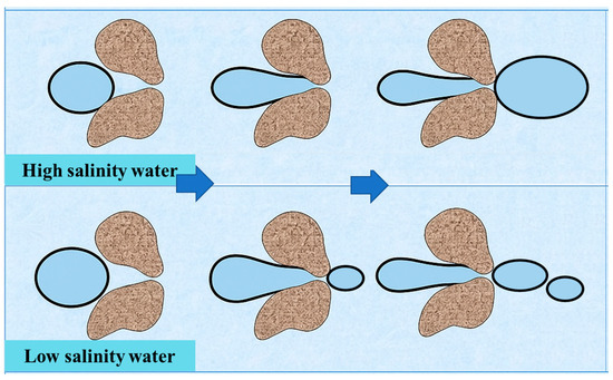 In recent years, many studies have focused on the mechanisms and influencing factors of low-salinity water flooding in conventional sandstone and carbonate reservoirs [5,6,7]. The results show that low-salinity water with different salinities has different effects on the wettability and interfacial tension of reservoir rocks. The performance of low salinity water flooding (LSWF) is also closely related to factors such as mineral composition of the reservoir, crude oil properties, and temperature. In tight sandstone reservoirs, the pores are compact and small in radius. The combined effect of pore size, wettability, and interfacial tension may lead to different EOR results [8]. In the B425 low-permeability block of Shengli Oilfield [9], LSWF significantly improved oil recovery. The main mechanisms included enhanced wettability, clay particle migration, and double-layer expansion. Staged salinity reduction injection performed better than direct LSWF, and the maximum increase in oil recovery reached 29.5%. Similar conclusions have been validated in other water–rock systems. For example, Tiwari et al. [10] reported that variations in salinity and temperature significantly influence fluid–rock interactions and transport processes during seawater intrusion into sediments. This evidence further supports the necessity of considering the combined effects of temperature and salinity when evaluating the mechanisms of low-salinity water flooding.