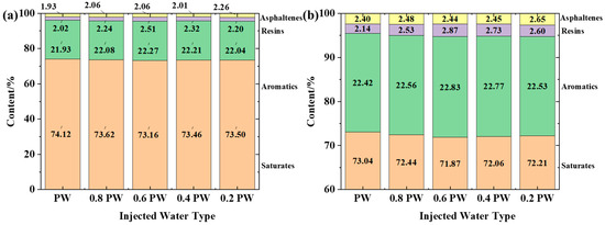 To quantify the effect of water quality on the adsorption of crude oil components onto rock surfaces, the following procedure was employed. Rock powder was dried at 105 °C for 12 h, and particles smaller than 75 µm were selected. The powder was then mixed with crude oil at a mass-to-volume ratio of 5:1 (10 g powder + 2 mL crude oil), placed in pressure-resistant glass bottles, and stirred to form an oil–sand mixture. The samples were aged at 70 °C for 4 weeks. After aging, 10 mL of the test water was added to each bottle. The oil–water–rock mixtures were then oscillated at 200 rpm for 24 h under two temperature conditions (30 °C and 70 °C) to reach equilibrium. After settling, the upper crude oil layer was collected for SARA analysis. Before measuring the contents of saturates, aromatics, resins, and asphaltenes, the recovered oil samples were centrifuged at 7500 rpm for 2 h to remove residual water. The analysis was conducted following the SY/T 5119-2016 standard using an IATROSCAN MK-6s thin-layer chromatography flame ionization detector (TLC-FID, Iatron Laboratories Inc., Tokyo, Japan) and an XS205DU electronic balance (Mettler Toledo, Greifensee, Switzerland) [40]. This procedure was used to evaluate how salinity and temperature affect the adsorption behavior of crude oil components on rock surfaces.