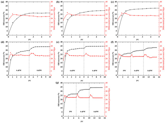 Oil recovery changes during multi-stage water flooding with different salinities, including (a) PW (Base Case), (b) 0.4 PW (Fluid/Fluid), (c) 0.6 PW (Rock/Fluid), (d) 0.4 PW–0.6 PW (Fluid/Fluid + Rock/Fluid), (e) 0.6 PW–0.4 PW (Rock/Fluid + Fluid/Fluid), (f) PW–0.4 PW–0.6 PW (Fluid/Fluid + Rock/Fluid), and (g) PW–0.6 PW–0.4 PW (Rock/Fluid + Fluid/Fluid).