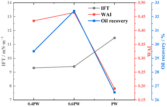 To further elucidate the combined effects of salinity and temperature on oil recovery, a correlation analysis was conducted based on the core flooding results. As shown in Figure 18, under the condition of 70 °C, oil recovery first increases and then decreases with decreasing salinity, reaching the optimum at 0.6 PW. This trend closely matches the variation in the wettability alteration index while showing a relatively weaker correlation with interfacial tension, indicating that wettability alteration plays a dominant role in enhancing oil recovery with changing salinity.