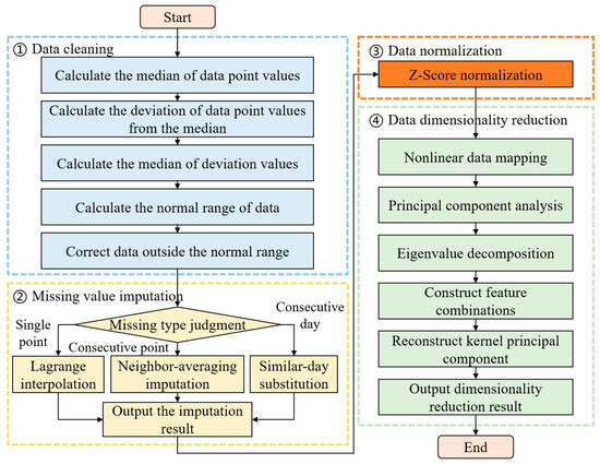 To ensure accurate risk assessment for high-current switchgear operation, historical load data, meteorological data, socio-economic data, and equipment operational status data are collected from relevant databases to support the training of an ensemble learning-based risk assessment model. However, the data acquisition process is often susceptible to communication device failures, extreme weather conditions, and other unexpected incidents, which can introduce noise, missing values, or anomalies into the dataset, thereby compromising the accuracy of the risk assessment [25]. Therefore, data preprocessing is essential. Specifically, this section first employs the median absolute deviation (MAD) method for data cleaning. To address different types of missing data, including single-day single-point missing values, single-day consecutive missing values, and multi-day consecutive missing values, three imputation strategies are adopted i.e., Lagrange interpolation, similar-day k-nearest neighbor averaging, and similar-day load substitution. Subsequently, Z-Score standardization is applied to normalize the data. On this basis, kernel principal component analysis (KPCA) is utilized for dimensionality reduction, enabling the selection of the most influential features for risk evaluation. This process ensures the provision of high-quality input data for model training. The overall procedures for preprocessing and dimensionality reduction in high-current switchgear operational data are illustrated in Figure 1.