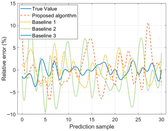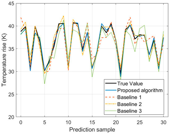 Figure 4 presents a comparison of temperature rise prediction results for 30 samples by various algorithms when the load current is 1 kA. Figure 5 shows the corresponding comparison of relative errors in the prediction results. Table 5 displays the results of various indicators for algorithms. The data in Figure 4 and Figure 5, and Table 6 indicate that R2 of the proposed algorithm reaches 0.981, which is 15.4%, 4.9%, and 24.8% higher than that of Baseline 1, Baseline 2, and Baseline 3, respectively, demonstrating a significant enhancement in fitting ability. Compared with Baseline 1, Baseline 2, and Baseline 3, MAE of the proposed algorithm is reduced by 64.7%, 48.7%, and 72.8%, respectively; MAPE is reduced by 65.1%, 49.5%, and 73.5%, respectively; and RMSE is reduced by 63.9%, 45.3%, and 69.8%, respectively, showing lower prediction errors and higher accuracy. The reason is that, in contrast to Baseline 1, Baseline 2, and Baseline 3, the proposed algorithm makes full use of a multi-level integrated learning framework. It introduces an attention mechanism based on the LSTM in the first layer, effectively capturing long-term dependent features in time series and achieving accurate prediction of load evolution trends and temperature rise processes. Meanwhile, the second layer adopts an improved RF for feature extraction, and by optimizing the feature selection mechanism and tree structure parameters, it improves the model’s ability to screen key operational features and the accuracy of preliminary evaluation. In addition, the third layer further constructs a prediction correction model based on ABPNN, which can effectively correct the risk assessment results output by LSTM.