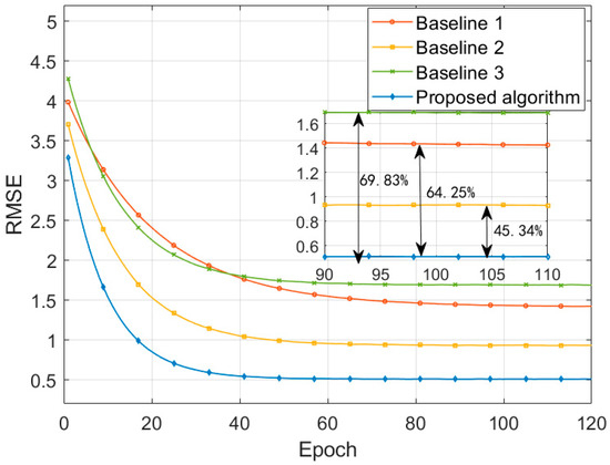 Figure 7 shows the RMSE convergence curves of different algorithms during the training process. Compared to the convergence values of Baseline 1, Baseline 2, and Baseline 3, RMSE of the proposed algorithm is reduced by 64.25%, 45.34%, and 69.83%, and the convergence speed is improved by 44.90%, 22.86%, and 6.90%, respectively. This is due to the use of an improved RF model for feature extraction and selection. By combining information gain ratio and feature stability for joint selection, and introducing the Spearman correlation coefficient to identify and remove highly correlated redundant features, it ensures that the feature set input into the subsequent deep learning models consists of highly correlated key influencing factors. This makes the learning process more efficient and significantly accelerates the convergence speed. In the second layer of the ensemble learning framework, an improved LSTM network with an attention mechanism is constructed. The switchgear operational data exhibits complex temporal dependencies, and the contribution of features at different time periods to risk assessment varies. The introduced temporal attention module enables the LSTM to dynamically assign weights to input features at different time steps, focusing on the most decisive information for the current prediction. This greatly enhances the model’s ability to capture complex temporal features in the data, making it particularly sensitive to anomalous data. At the same time, the optimized gating mechanism effectively alleviates the gradient issues in long sequences, ensuring stable training of the model in deep networks. The introduction of the attention mechanism allows the model to more effectively identify and utilize key information, preventing overfitting to less important information. This enables the model to find the global optimal solution more quickly during training and achieve lower prediction errors.