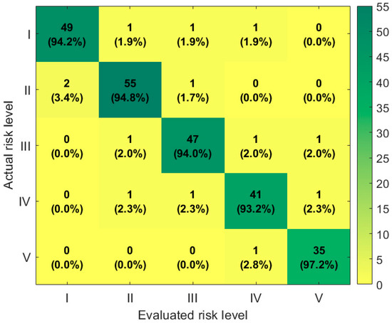 The confusion matrix shown in Figure 8 demonstrates the classification performance of the proposed algorithm on risk samples. The results show that the proposed algorithm achieves recognition accuracy of 94.2%, 94.8%, 94.0%, 93.2%, and 97.2% for risk levels I, II, III, IV, and V, respectively, maintaining high recognition accuracy across all levels. The reason is that, in the ensemble learning framework, ABPNN serves as the final correction layer, performing deep fusion and optimization of the preliminary risk assessment results from the first two layers. Traditional BP neural networks are prone to becoming stuck in local optima or suffering from the curse of dimensionality, but the adaptive genetic algorithm introduced in this paper effectively overcomes these shortcomings. It dynamically optimizes the network structure and weights of ABPNN, enhancing its global search capability, and enhances the learning effect of nonlinear features by adaptively adjusting the learning rate and error feedback mechanism. Even if the first two layers exhibit slight deviations under certain complex conditions, ABPNN can precisely correct these deviations through its adaptive correction ability, significantly improving the accuracy of the final risk level classification and the robustness of the system.