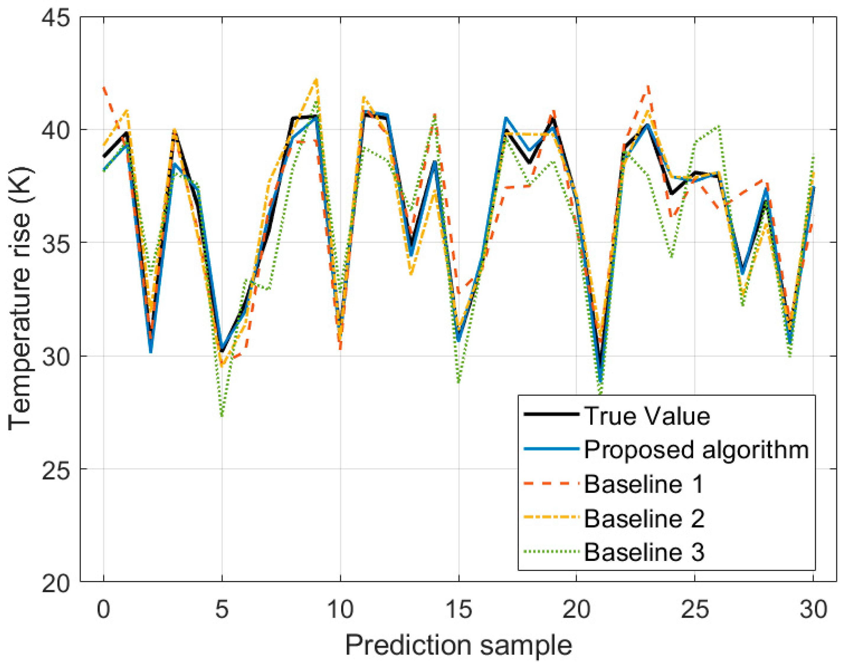 Figure 4 presents a comparison of temperature rise prediction results for 30 samples by various algorithms when the load current is 1 kA.
