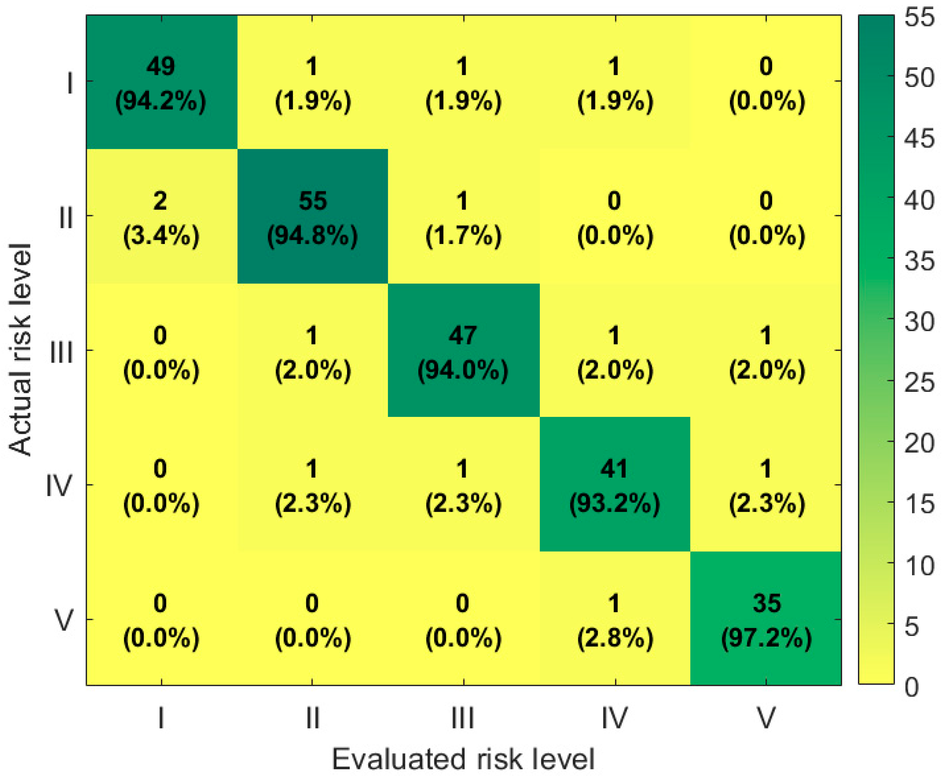 Figure 8 demonstrates the classification performance of the proposed algorithm on risk samples. The results show that the proposed algorithm achieves recognition accuracy of 94.2%, 94.8%, 94.0%, 93.2%, and 97.2% for risk levels I, II, III, IV, and V, respectively, maintaining high recognition accuracy across all levels. The reason is that, in the ensemble learning framework, ABPNN serves as the final correction layer, performing deep fusion and optimization of the preliminary risk assessment results from the first two layers. Traditional BP neural networks are prone to becoming stuck in local optima or suffering from the curse of dimensionality, but the adaptive genetic algorithm introduced in this paper effectively overcomes these shortcomings. It dynamically optimizes the network structure and weights of ABPNN, enhancing its global search capability, and enhances the learning effect of nonlinear features by adaptively adjusting the learning rate and error feedback mechanism. Even if the first two layers exhibit slight deviations under certain complex conditions, ABPNN can precisely correct these deviations through its adaptive correction ability, significantly improving the accuracy of the final risk level classification and the robustness of the system.