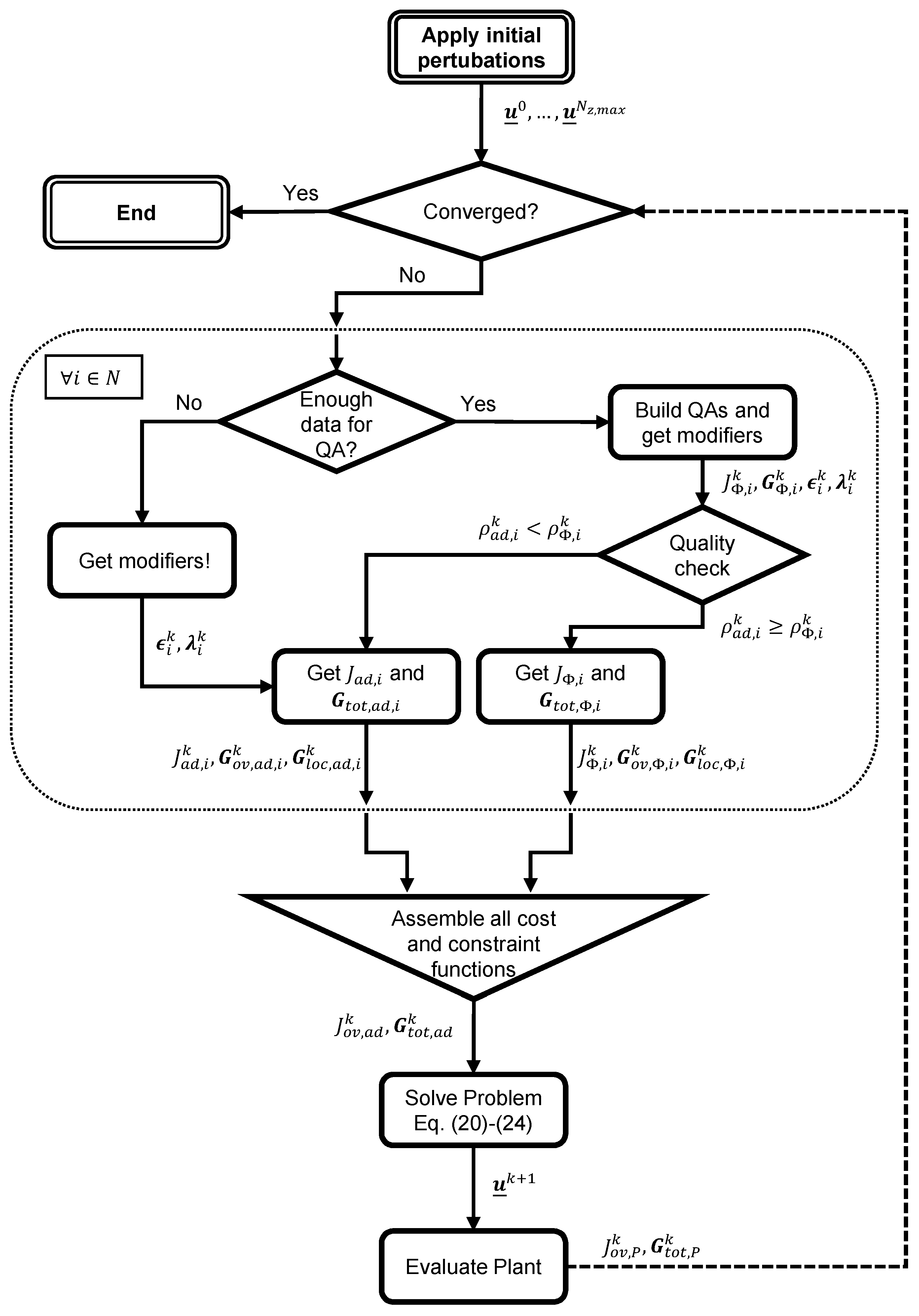 25], the same approach was applied to output Modifier Adaptation (MAy). In MAy, the model outputs rather than the objective and constraint functions are adapted. Consequently, the modifiers of the sub-models can be computed individually and the modified outputs are then fed into the global constraint and objective functions.