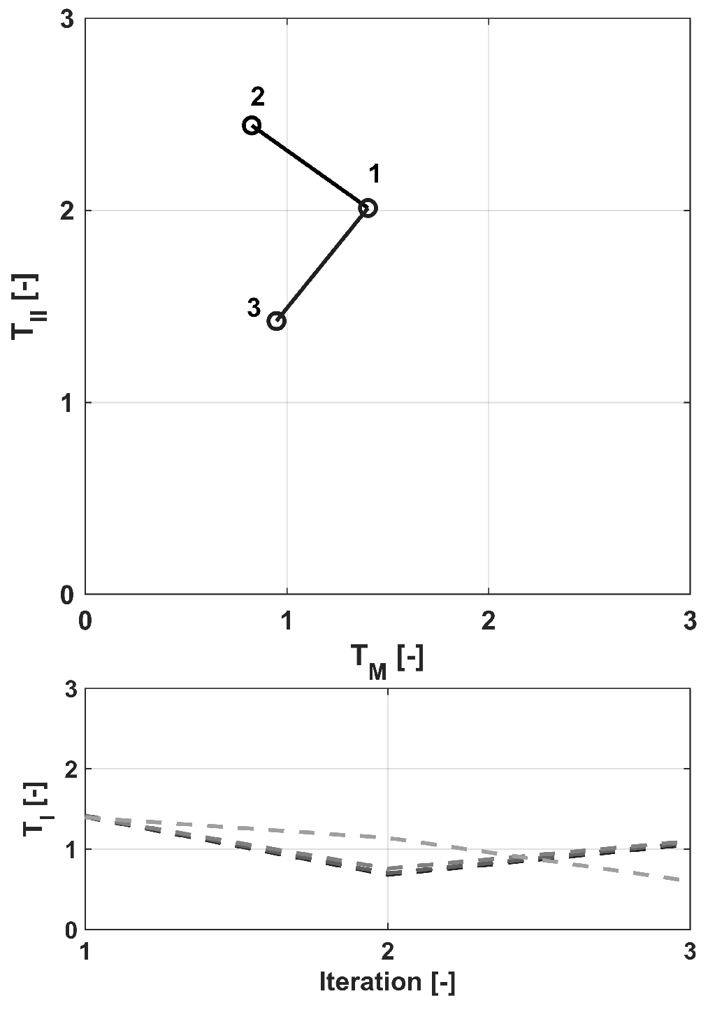 Figure 8. The initial set-points and the two perturbations are plotted for the models in the reaction stage (lower graph) and separation stage (upper graph). The set-points of the separation stage are placed to ensure a good approximation using FD as there are two inputs. After applying two vectors of set-points to the reaction stage, the quadratic approximations can already be computed as the models only have one input. Due to the parallel structure in the reaction stage, only two trajectories are visible as the individual trajectories of the reactors lie on top of each other.