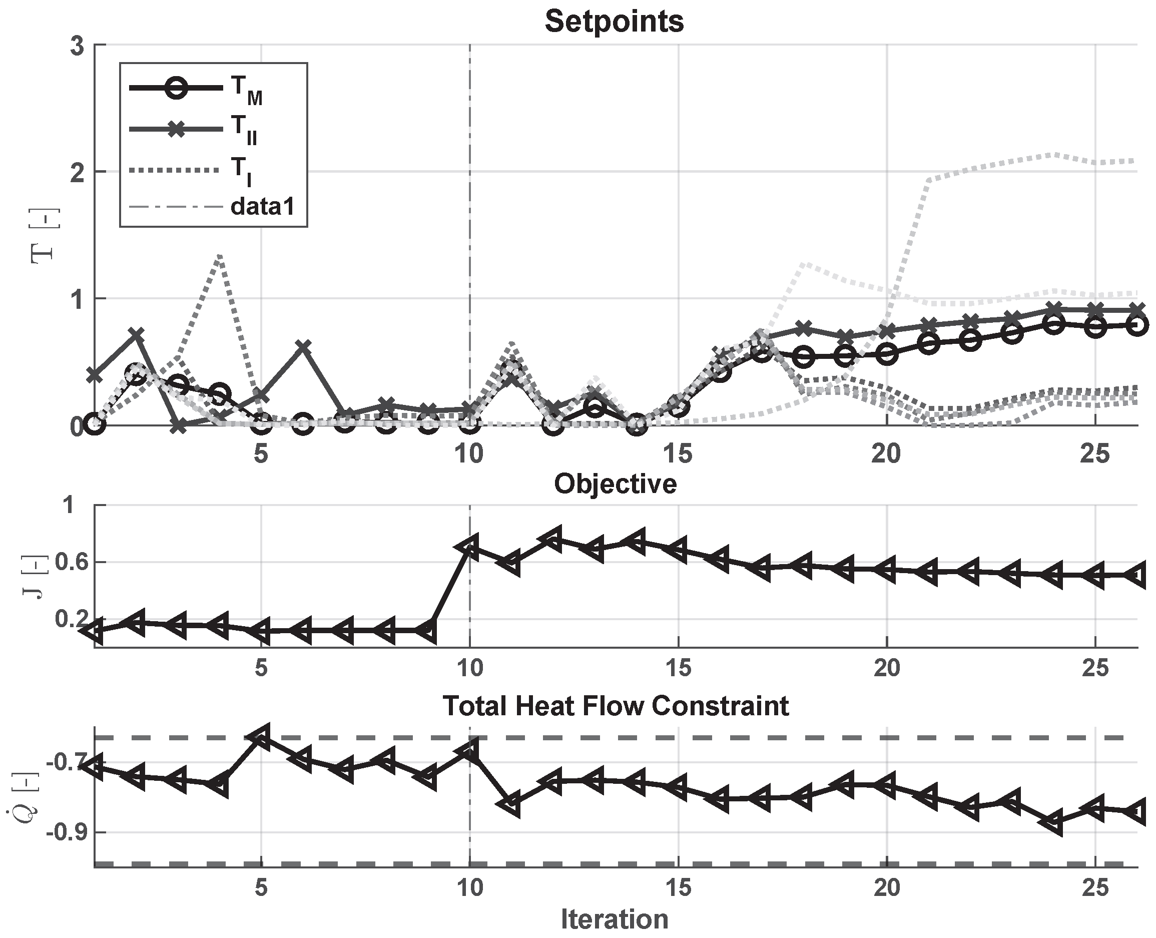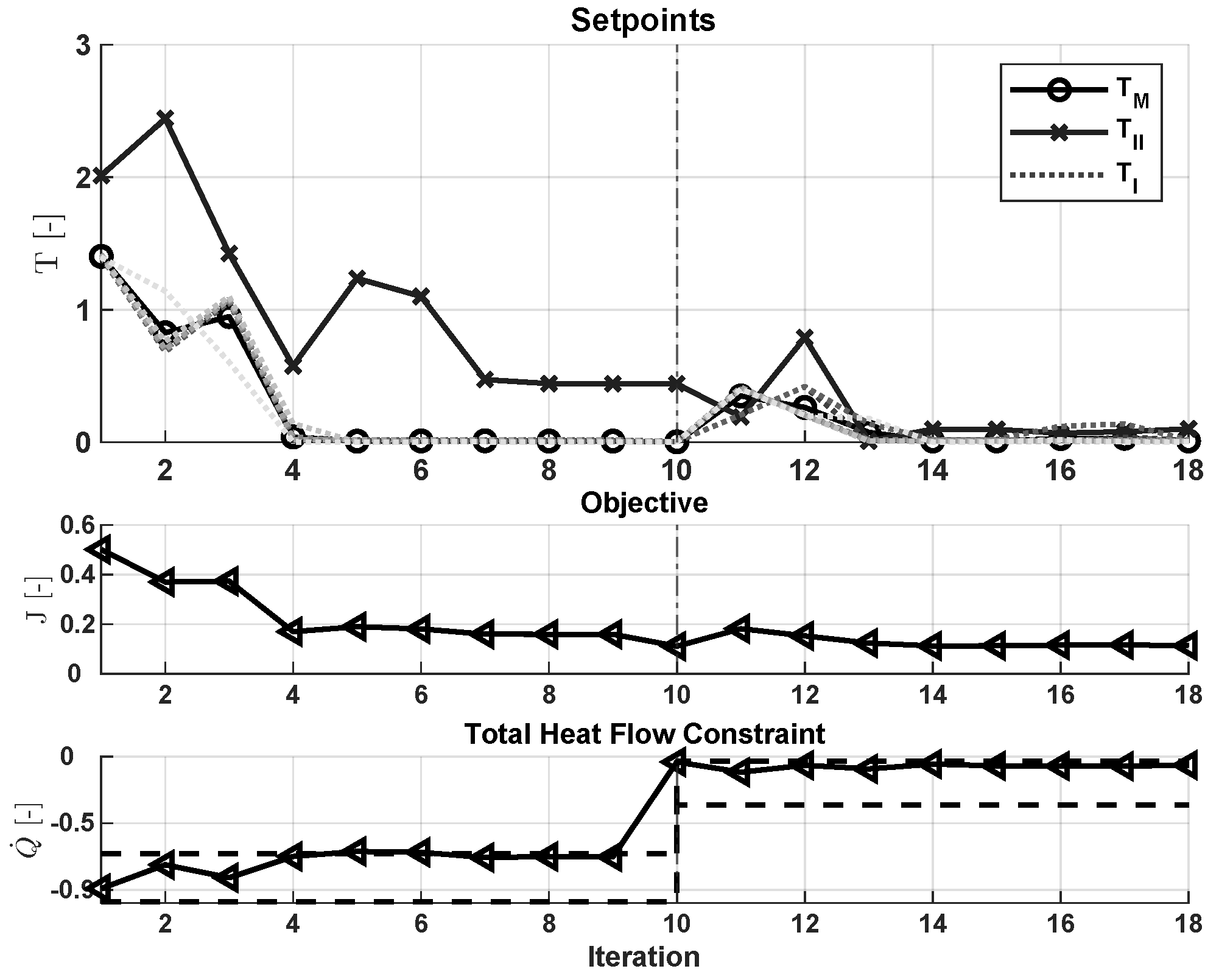 Section 4. Two different scenarios are investigated. In the first scenario, the RTO algorithm is started from a standard operating point of the plant to find optimal operation conditions that minimize the fouling in the heat exchangers. After the algorithm has converged, the total load of the plant is changed, which acts as a known disturbance. In the second trial, the algorithm is started from a different operating point and the process is disturbed after convergence by a change in the heat transfer coefficients of a subset of the heat exchangers, which represents an unmeasured change in the behaviour of the plant. In between the two experiments, the OTS was updated by Covestro in the course of regular maintenance, which leads to small differences in the initial steps of the algorithms. In all experiments, the same formulation of the optimization problem ((