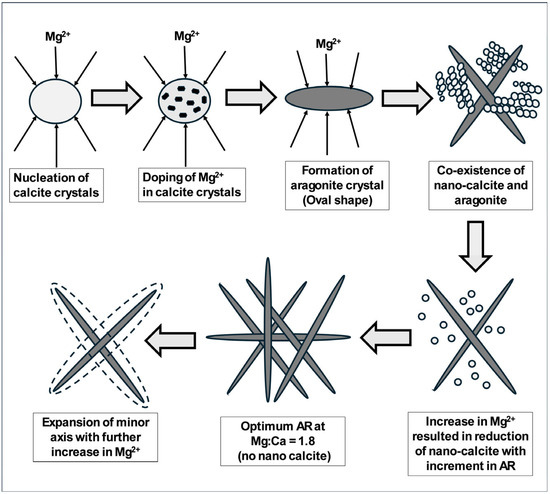 Natural precipitation of calcium carbonate CaCO3 from a saturated solution of lime Ca(OH)2 and CO2 under standard chemical reaction conditions results in the rhombohedral and scalenohedral crystalline form of calcite [13]. However, the addition of magnesium ions to the crystallizing medium opens a whitespace of morphological possibilities. Aragonite crystals are metastable but are marginally more stable than vaterite. Aragonite exists naturally and is the main component of nacre and mollusk shells [14]. It is well established that magnesium exerts a significant influence on calcium carbonate crystallization and that aragonite typically crystallizes in preference to the thermodynamically stable polymorph calcite, when the magnesium Mg2+ concentration is sufficiently high [15]. It has been widely observed that, at high concentrations, magnesium ions Mg2+, are known to induce the synthesis of aragonite [16]. Various theories have been proposed to support this observation, namely the calcite poisoning model, the inhibition of calcite nucleation model, the adsorption of magnesium ions at the calcite growth site model, the distortion of the calcite lattice model, the change in the surface charge model, and, lastly, the kinetic problem of cation dewatering model as emphasized by Nancollas et al. [17]. However, the exact role that Mg2+ plays in the precipitation of aragonite, as opposed to calcite, is still widely debated by many researchers, but the most commonly expressed idea is that magnesium inhibits the growth of calcite and, therefore, allows aragonite phase to crystallize rapidly as pointed out by Bischoff, 1968 [18]; Bischoff and Fyfe, 1968 [19]; Berner, 1975 [20]; Fernández-Díaz et al., 1996 [21]; and a review work by De Choudens-Sánchez et al. [11]. Hence, the inhibition of calcite growth is generally attributed to “poisoning” of the growth sites on the calcite crystal faces by Mg2+ ions that are more strongly hydrated than the Ca2+ ions [22,23].