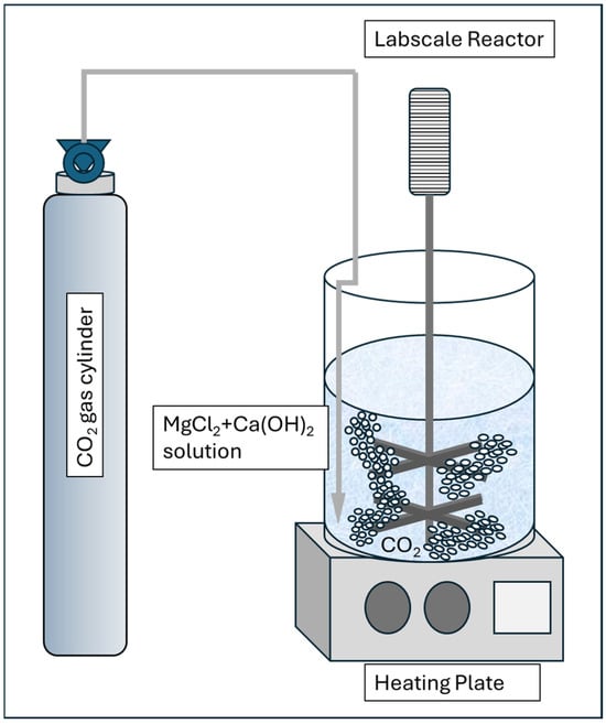 - Solution of MgCl2 and Ca(OH)2 mixture with specific concentrations as demonstrated by Park et al. (2008) [12] and Shen et al. (2022) [50] was heated until reaching the target temperature between 40 and 90 °C and stirred at 250 rpm [43,44,45].