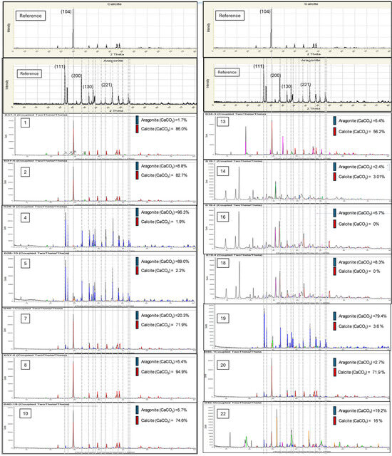 The total collected diffractograms analyzed using the software provided, Diffrac Plus EVA, are shown in Figure 3 below. Diffractograms of samples not shown in Figure 3 are those found to have insignificant percentage of aragonite phase and having similar diffractogram pattern with sample#1.