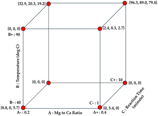 where, at T = 90 °C and ratio of feedstock Mg/Ca = 0.4, , are constants for the individual factors A, B and are constants for the two-way interaction factors BC.
