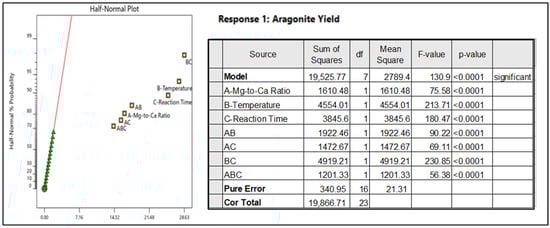 Based on the p-value calculated for the specific response versus the general population, factor A—Mg-to-Ca Ratio, factor B—Temperature, and factor C—Reaction Time have significant effect on aragonite yield, and a combination of all three factors ABC contribute positively to the aragonite yield. Main factors contributing positively to the aragonite yield with the highest effect are B—temperature (with F-value of 231) and C—Reaction Time (with F-value of 180), whereby both two-way interaction factors BC provided the highest effect for aragonite yield (with F value of 230). Ratio of Mg-to-Ca, or Factor A, is still a significant factor which contributes to aragonite yield, but the nominal effect of it is much less than Temperature B and Reaction Time C with a F value of only 75. Hence, from the randomized run conducted, it is proposed that the optimization of the aragonite production will focus on, firstly, Factor B—Temperature and C—Reaction Time while optimizing Factor A—Ratio of Mg-to-Ca, which involved the usage of magnesium chloride MgCl2 as the aragonite inducer or chemical agent that is taken as a trade-off between maximizing aragonite yield and minimizing cost of MgCl2 in this process.