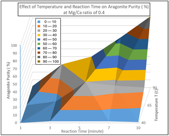 An additional experimental run was proposed and conducted to investigate and optimize the effect on aragonite yield by varying Mg-to-Ca ratios between 0.2 and 1.28 while fixing reaction time at 10 min and temperature to 90 °C based on the identified significant main factors established in Figure 4 and Figure 5 above. The results are presented in Figure 7 below.