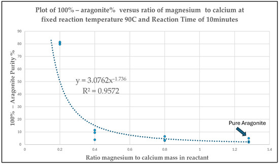 Plot of Occurrence of Non-aragonite phase (100%–Aragonite Purity) versus Ratio of Mg-to-Ca in reactant between 0.2 and 1.28 at Fixed Reaction Time of 10 min and Temperature of 90 °C.