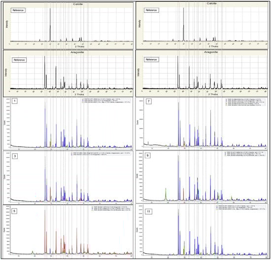 The primary analysis in this study, which was the XRD analysis, was conducted using the model Bruker D8 Advance (Bruker Physik-AG, Karlsruhe, Germany)with a copper tube anode material. This one-dimensional fast Lynk-Eye detection is set with the °2Θ range between 5° and 80°, a step size of 0.025°, and a step duration of 0.3 sec/step. All the collected diffractogram was analyzed using the software provided, Diffrac Plus EVA v.7.0. The concentration of both aragonite and calcite in the sample is determined by quantitative analyses based on the following established method as reported by Department of Geology, University of Georgia [46]. Expanding the basis, or quantitative analyses, here, it was established that aragonite phase has the greatest peak (111) at °2Θ = 31, and other prominent peaks (200) at °2Θ = 36, (130) at °2Θ = 38, and, most importantly, (221) at °2Θ = 45 as a secondary signature indicator of the presence and abundance of aragonite as a monocrystalline phase of calcium carbonate. On the other hand, calcite has a prominent peak of (104) at °2Θ = 34 to the right of aragonite’s (111) peak. Unfortunately, the aragonite peak begins to subside when aragonite content goes below 25% and quantitative detection can become misleading at times. The solution to this problem is to use the aragonite (221) peak as an alternative indicator of the abundance of aragonite and perform a comparative ratio with the calcite (104) peak.
