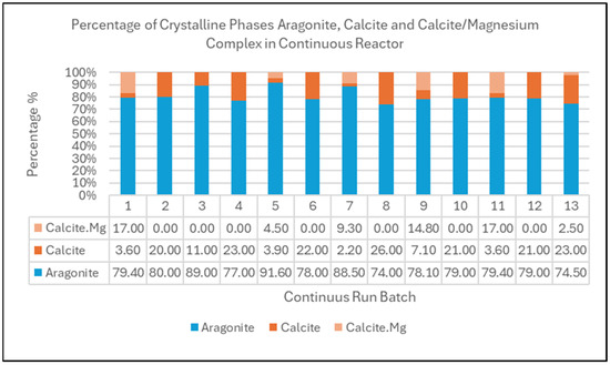 The optimization of Mg-to-Ca ratios will have to consider the trade-off between treat rate of magnesium chloride MgCl2 as a chemical inducer versus percentage yield of aragonite. Maintaining aragonite purity to be more than 91.77%, the process conditions for the continuous run can be carried out anywhere between Mg-to-Ca ratios of 0.4 and 1.28. In order to minimize the cost associated with magnesium chloride MgCl2 usage, the ratio of magnesium to calcium or Mg-to-Ca can be fixed at 0.4.