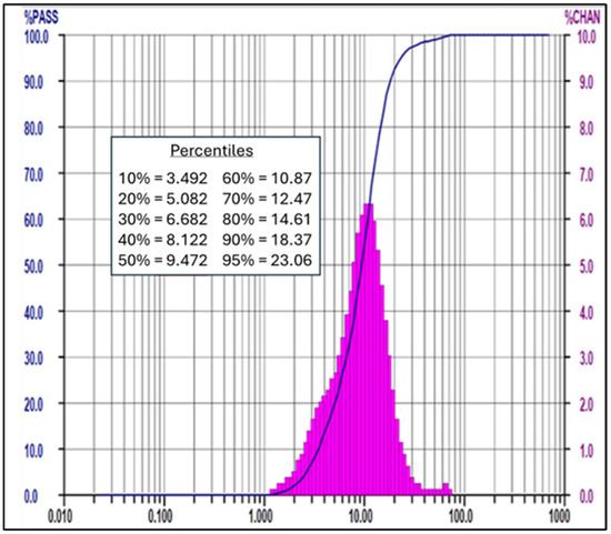In addition to the XRD analysis, the particle size analysis, PSA, was carried out using the Malvern Mastersizer 3000E Particle Size Analyzer (Malvern Panalytical, Malvern, UK) to determine the particle size distribution using the wet method. The ionic concentration in the spent liquid reactant was analyzed using the equipment, ICP-OES Avio 550 by Perkin Elmer (Waltham, MA, USA), and the APHA Method 3120: Standard Methods for the Examination of Water and Wastewater.