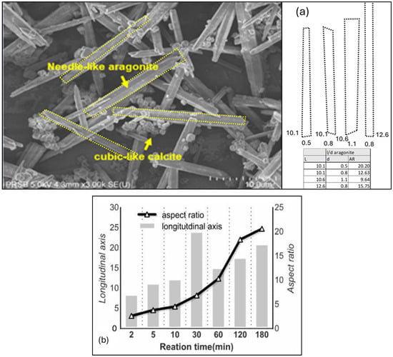 Laifeng Wang et al. [27] successfully synthesized uniform aragonite particles directly in the presence of urea at elevated temperature, under restricted experimental conditions, by aging solutions of calcium salts in the presence of urea at 90 °C. Peiliang Shen (2022) [50] developed an innovative wet carbonation process to produce aragonite whisker-rich materials (AWM) from cement and simulated flue gas, enhancing cement properties and capturing CO2. Needle-like aragonite whiskers (10- to 30-micron length, and 0.5- to 2-micron diameter) were synthesized rapidly at 80 °C with 0.05 M/L MgCl2. High Ca2+ concentration and Mg2+/Ca2+ molar ratio > 0.12 favored aragonite formation. Mixing AWM with cement significantly improved mechanical performance and reduced CO2 emissions by 25.3%. Xiaolei Ding et al. (2024) [51] successfully demonstrated the preparation of aragonite from calcium carbonate via wet carbonation method to improve properties of steel slag building materials. This work successfully validates the fact that the formation of needle-shaped aragonite can be firmly regulated by the addition of magnesium hydroxide and magnesium chloride as crystalline control agents. Mahmut Altiner et al. [52] were also successful in developing production method and characterization of synthetic aragonite prepared from dolomite by eco-friendly leaching–carbonation process as well, in which pure aragonite crystals were successfully synthesized at temperatures between 40 and 70 °C, with a CO2 flow rate of 3.00 L/min and a stirring speed of 750 rpm. The reaction time decreased with an increase in the CO2 flow rate.