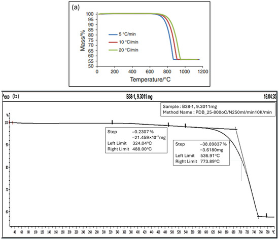 (a) Reference TGA analysis by Isabel Galan [65] about different heating rates’ effect on thermal decomposition curve of pure calcium carbonate. (b) TGA analysis by thermal gravimetric analysis for solid precipitate for the 13 continuous run samples.