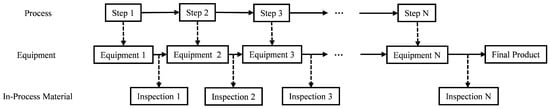 Figure 1 illustrates the production workflow of a typical process manufacturing system. In such systems, the complete production process is usually composed of multiple processing steps connected in a predefined sequence. Each step is typically equipped with one or more devices responsible for executing specific operations. After the execution of each step, the in-process material is inspected to collect key process state data and evaluate the effectiveness of the operation. This type of production process exhibits distinct structural continuity and stage-wise evolution, forming a complex system characterized by multi-stage interactions and multi-parameter coupling. To ensure traceability and consistency, each process step is coupled with a specific equipment unit and followed by inspection. The final inspection leads to the release of the finished product, completing the process flow. This schematic structure serves as the abstract foundation for the PEI simulation organization.