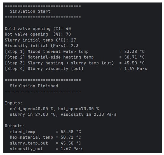 To verify the structural organization and execution feasibility of the PEI simulation method, a simplified simulation scenario is constructed involving the following process chain: cold/hot water control → thermal mixing → slurry state evolution. This process exhibits clear stepwise segmentation and state transfer characteristics, making it suitable for demonstrating the collaboration among the Process Structure, Equipment Behavior, and In-Process State modules.