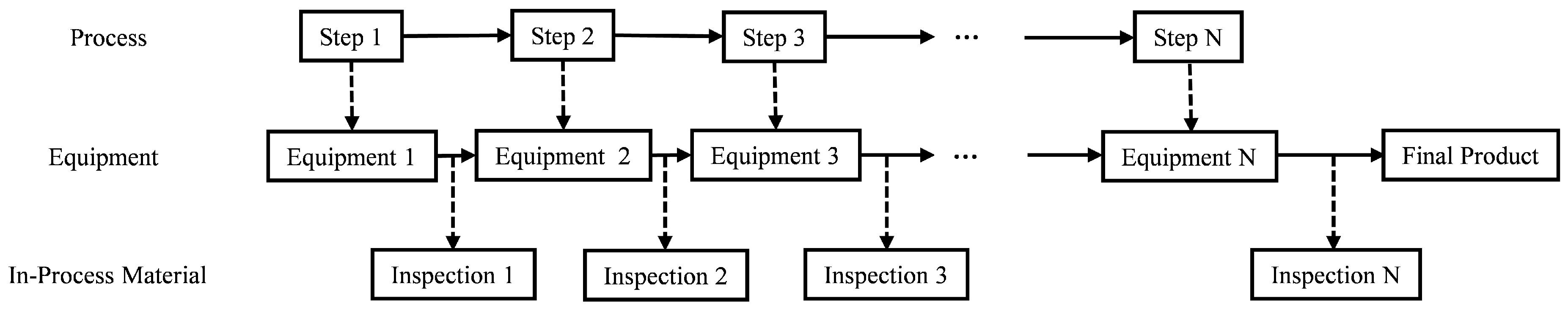 Figure 1 illustrates the production workflow of a typical process manufacturing system. In such systems, the complete production process is usually composed of multiple processing steps connected in a predefined sequence. Each step is typically equipped with one or more devices responsible for executing specific operations. After the execution of each step, the in-process material is inspected to collect key process state data and evaluate the effectiveness of the operation. This type of production process exhibits distinct structural continuity and stage-wise evolution, forming a complex system characterized by multi-stage interactions and multi-parameter coupling. To ensure traceability and consistency, each process step is coupled with a specific equipment unit and followed by inspection. The final inspection leads to the release of the finished product, completing the process flow. This schematic structure serves as the abstract foundation for the PEI simulation organization.
