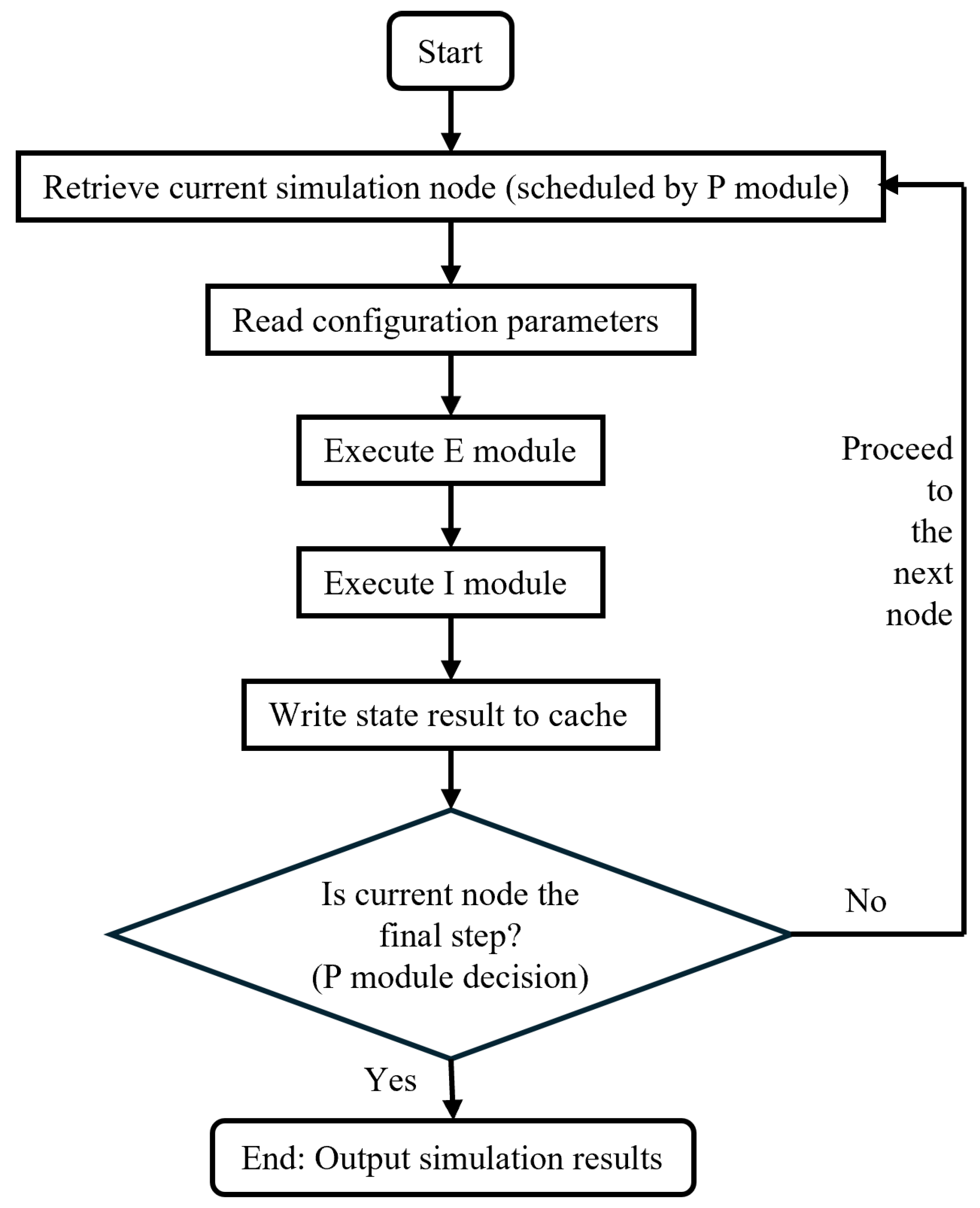 Figure 3. The system first uses the P module to identify the current simulation node and retrieve its assigned parameters. Then, the E module computes the equipment response from the input settings, and this response is passed to the I module along with the upstream material state. The I module calculates the updated material state, which is then written into the simulation state cache. The P module checks whether the current node is the final step. If not, it proceeds to the next node and repeats the process. If it is the final step, the simulation terminates and outputs the complete set of simulation results.