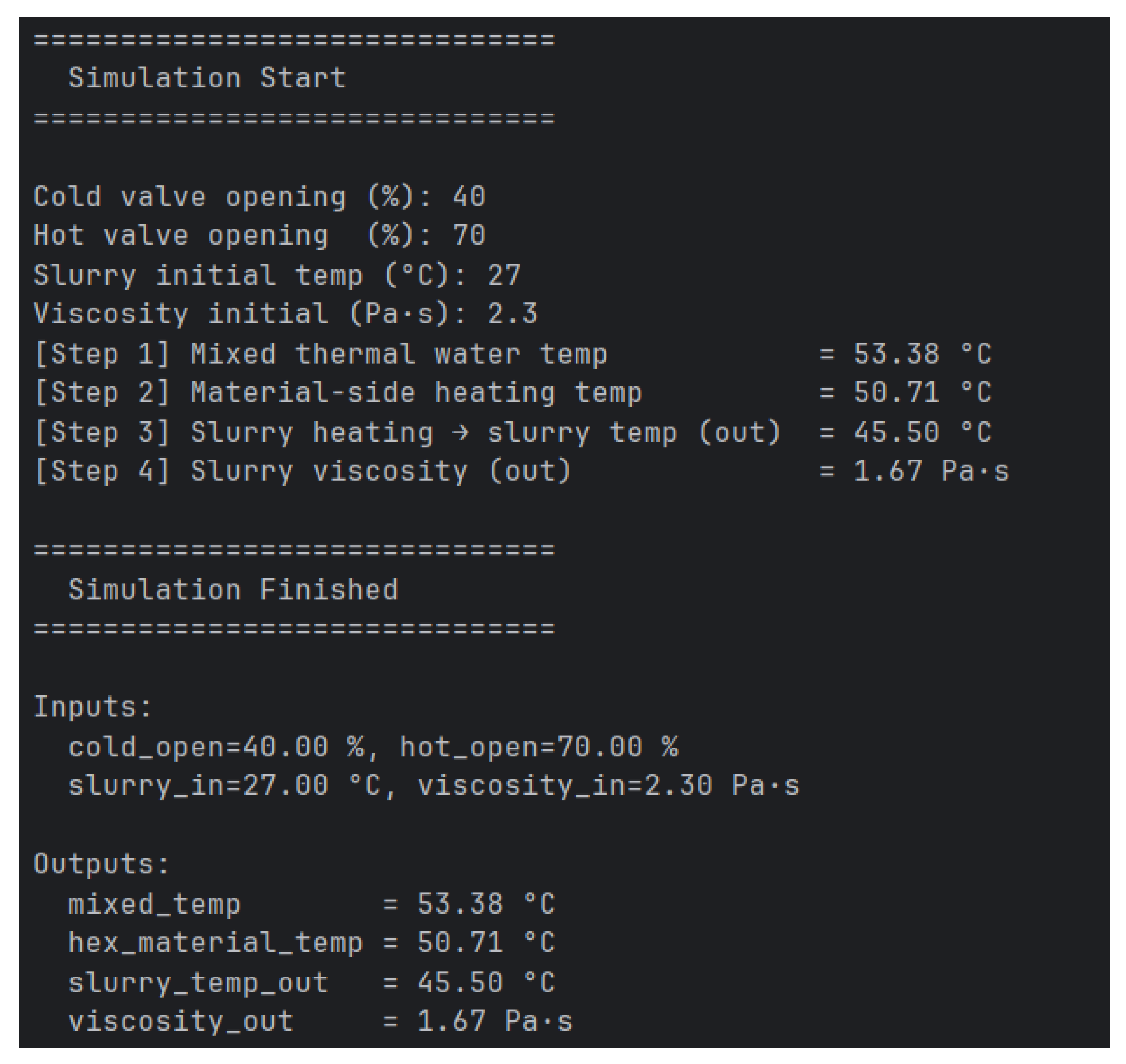To verify the structural organization and execution feasibility of the PEI simulation method, a simplified simulation scenario is constructed involving the following process chain: cold/hot water control → thermal mixing → slurry state evolution. This process exhibits clear stepwise segmentation and state transfer characteristics, making it suitable for demonstrating the collaboration among the Process Structure, Equipment Behavior, and In-Process State modules.