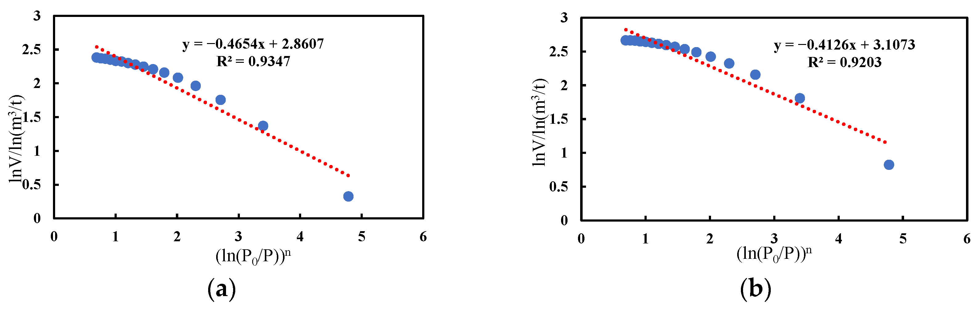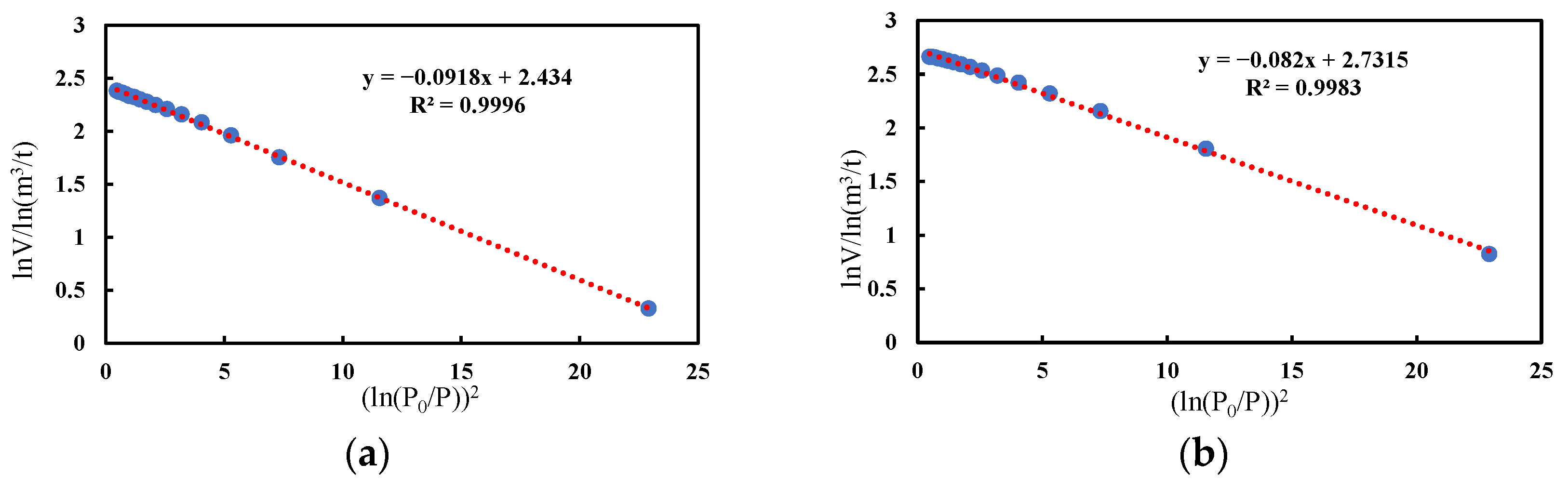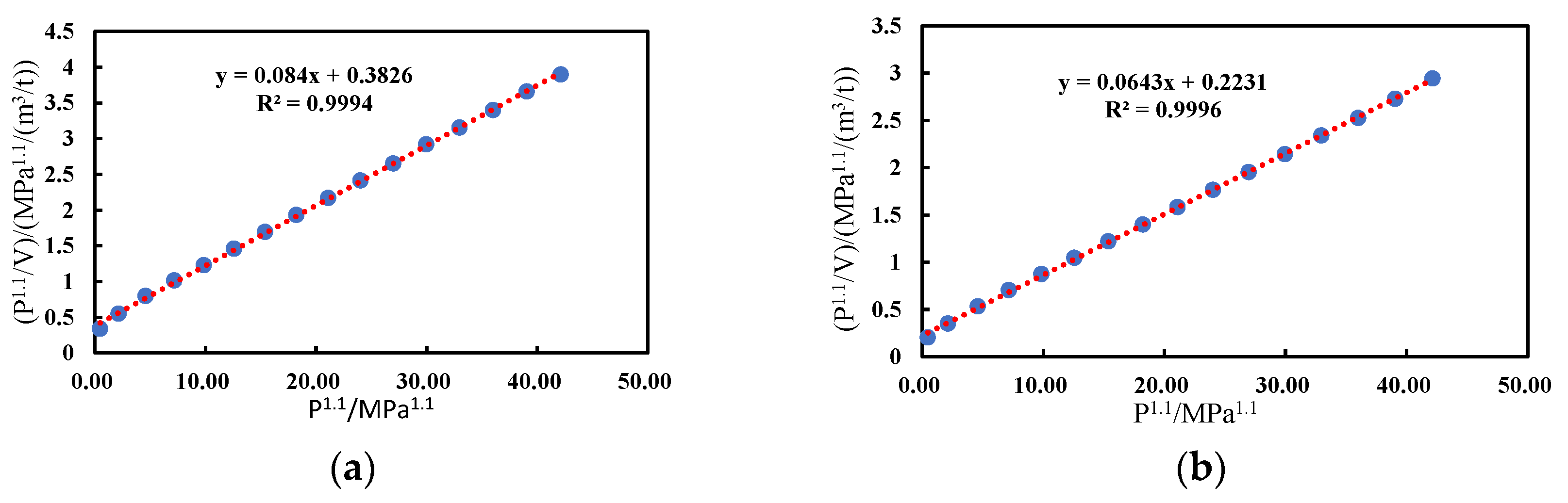 According to the deformation fitting equation of different adsorption and desorption models, different parameter combinations are selected to form the horizontal and vertical coordinates, and the experimental isothermal adsorption/desorption data are then plotted and fitted with a linear regression. A model is considered suitable for characterizing the adsorption/desorption characteristics of coal and rock matrices in the target formation when it demonstrates both a (1) strong linear correlation (R2 > 0.95) and (2) good fitting performance.