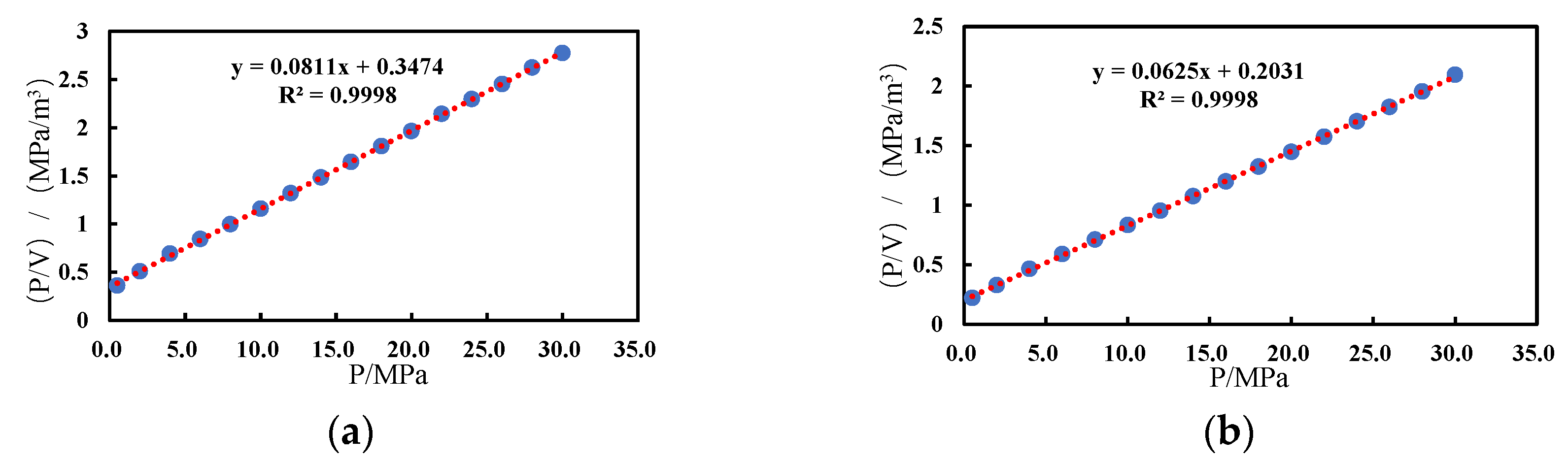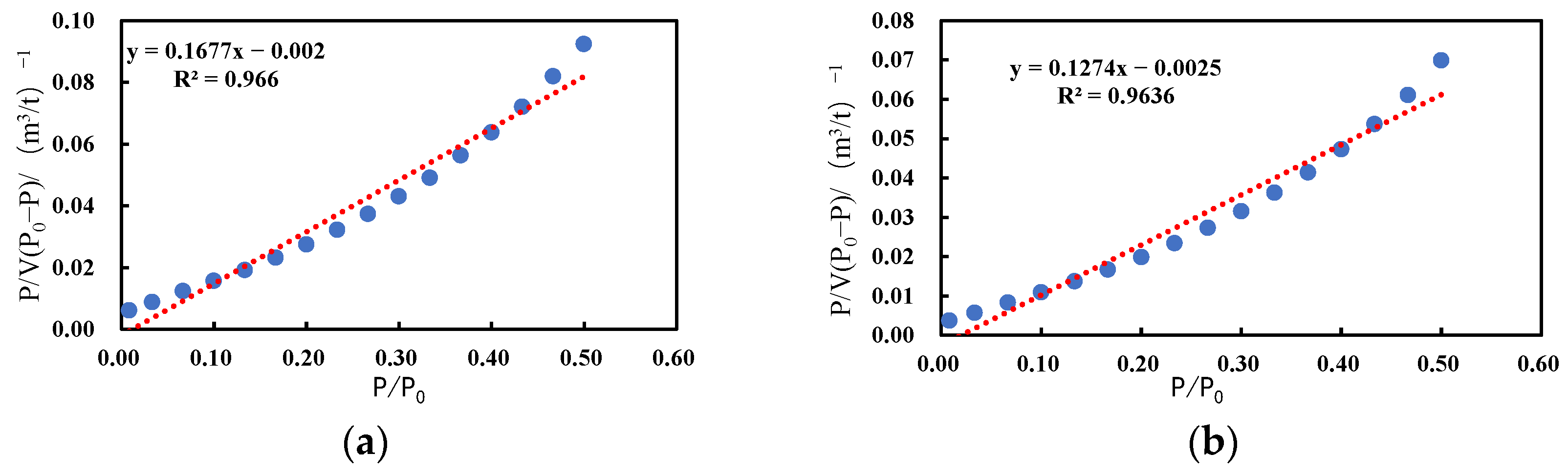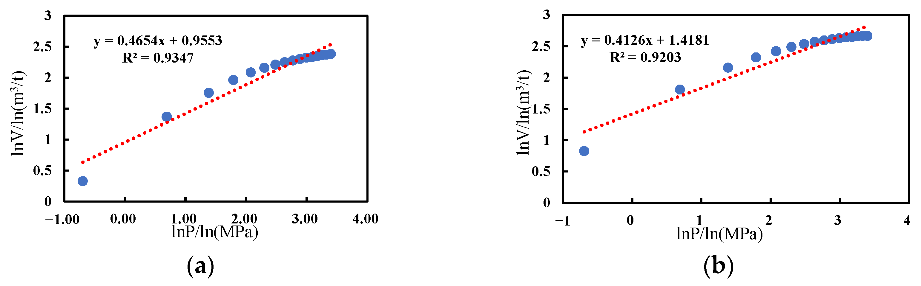 According to the deformation fitting equation of different adsorption and desorption models, different parameter combinations are selected to form the horizontal and vertical coordinates, and the experimental isothermal adsorption/desorption data are then plotted and fitted with a linear regression. A model is considered suitable for characterizing the adsorption/desorption characteristics of coal and rock matrices in the target formation when it demonstrates both a (1) strong linear correlation (R2 > 0.95) and (2) good fitting performance.