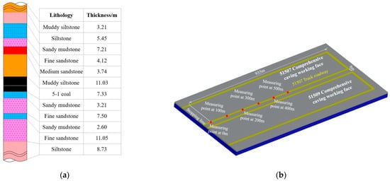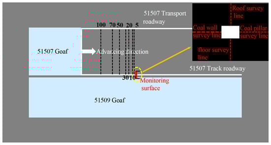 To determine the deformation and failure characteristics of the retained roadway during secondary mining, the cross-point method was employed to monitor the surface displacement of the 51507 track gateway. Monitoring points were arranged every 100 m within the 0–500 m range along the excavation direction of the track gateway, as shown in Figure 1.