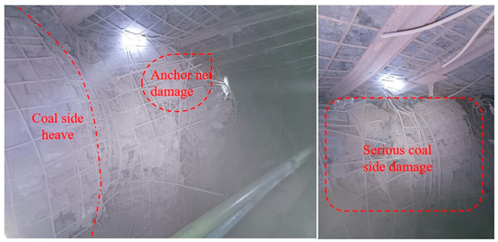 After the mining of the upper section (51509 working face), the redistribution of surrounding rock stress caused the overlying strata’s gravitational load to transfer toward the periphery of the goaf. During the mining of the 51507 working face, the retained roadway was subjected to superimposed effects from the advanced abutment pressure of the working face and the lateral stress concentration of the goaf, leading to intensified deformation and failure of the surrounding rock. Local roof collapses and rib spalling were observed, as shown in Figure 3.