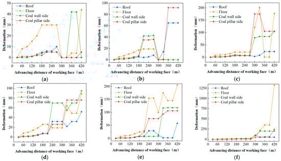 Surrounding rock deformation amounts at different monitoring positions along the GER: (a) Surrounding rock deformation at 0 m. (b) Surrounding rock deformation at 100 m. (c) Surrounding rock deformation at 200 m. (d) Surrounding rock deformation at 300 m. (e) Surrounding rock deformation at 400 m. (f) Surrounding rock deformation at 500 m.
