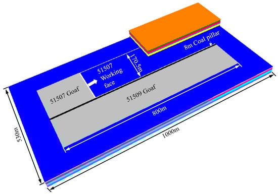 To investigate the stress–energy evolution laws of surrounding rock during secondary mining in narrow coal pillar roadways within thick coal seams, a FLAC3D three-dimensional numerical model was developed based on the engineering geological conditions of Liuyuanzi Coal Mine [21,22]. The Mohr–Coulomb constitutive model was adopted, with model dimensions of 530 m × 1000 m × 76 m (x × y × z), as shown in Figure 6. The mesh size of the surrounding rock cells in the 51507 track gateway was refined to 0.5 m. The overlying strata thickness was 420 m, so a vertical load of 10.5 MPa was applied to the top surface to simulate the self-weight of the loose overburden. The sides and bottom of the model were fixed constraints. The lateral pressure coefficient was set to 1.5, and the initial stress gradient was 0.025 MPa. The physical and mechanical parameters of the rock are listed in Table 1.