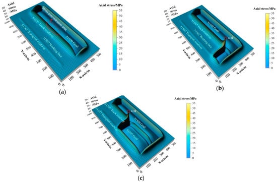Three-dimensional distribution maps of vertical stress in the surrounding rock under different advancing distances during secondary mining: (a) secondary mining at 0 m; (b) secondary mining at 100 m; (c) secondary mining at 400 m.