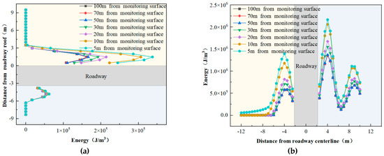 Distribution curves of dissipated energy in the roof and floor of the GER: (a) distribution curves of dissipated energy in the roof and floor of the GER; (b) distribution curves of dissipated energy in the two sides of the GER.