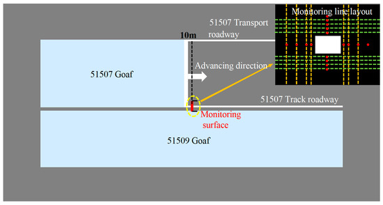 Schematic diagram of monitoring line layouts for the GER surrounding rock when secondary mining reaches 10 m from the monitoring surface.