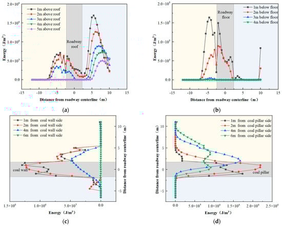 To investigate the dissipated energy distribution characteristics in different regions of the retained roadway surrounding rock under secondary mining disturbances, monitoring lines were arranged at 1 m intervals from the roof and floor surfaces and at 1 m, 2 m, 4 m, and 6 m from the rib surfaces on the monitoring section (Figure 10). The dissipated energy distribution curves when the working face was 10 m from the monitoring section are shown in Figure 11.