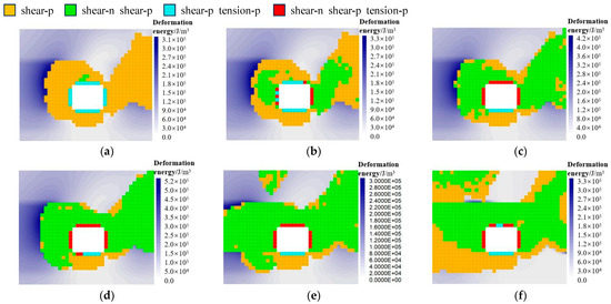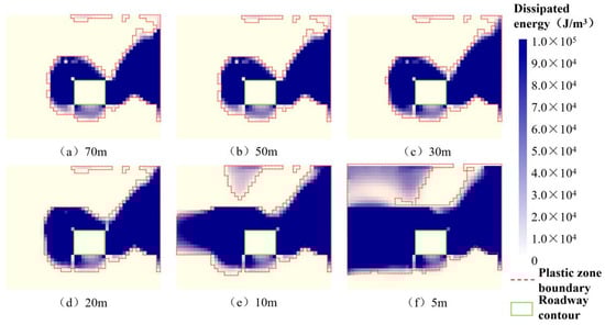 Distributions of elastic deformation energy and plastic zones in the GER surrounding rock under different advancing distances during secondary mining: (a) 70 m; (b) 50 m; (c) 30 m; (d) 20 m; (e) 10 m; (f) 5 m.