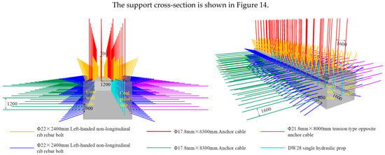 Temporary support: A single row of DW28 hydraulic props was installed within 20 m ahead of the working face, 0.5 m from the coal pillar rib, with a spacing of 1600 mm to ensure the stability of the surrounding rock at the roadway head during secondary mining. The support cross-section is shown in Figure 14.
